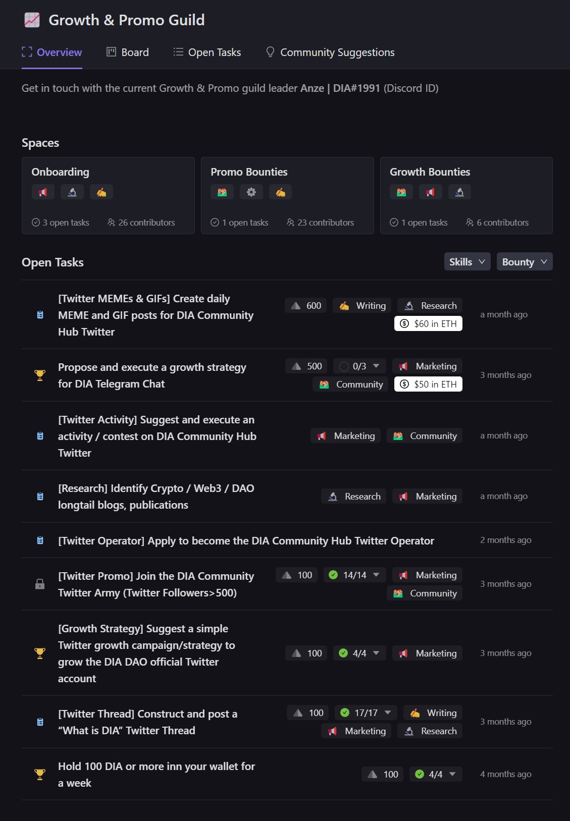 <figure><img src="https://1687189122-files.gitbook.io/~/files/v0/b/gitbook-x-prod.appspot.com/o/spaces%2Fmz45Sf20wOeXiwishs9R%2Fuploads%2F2UVFFTV9Yu2W6TjBnnE4%2FContributors-Bounties-10.jpg?alt=media&#x26;token=91465a3a-e01f-4f97-93ba-12ca69e1502c" alt=""><figcaption><p>An example of Open Tasks on the Overview page from DIA DAO's Growth &#x26; Promo Guild</p></figcaption></figure>