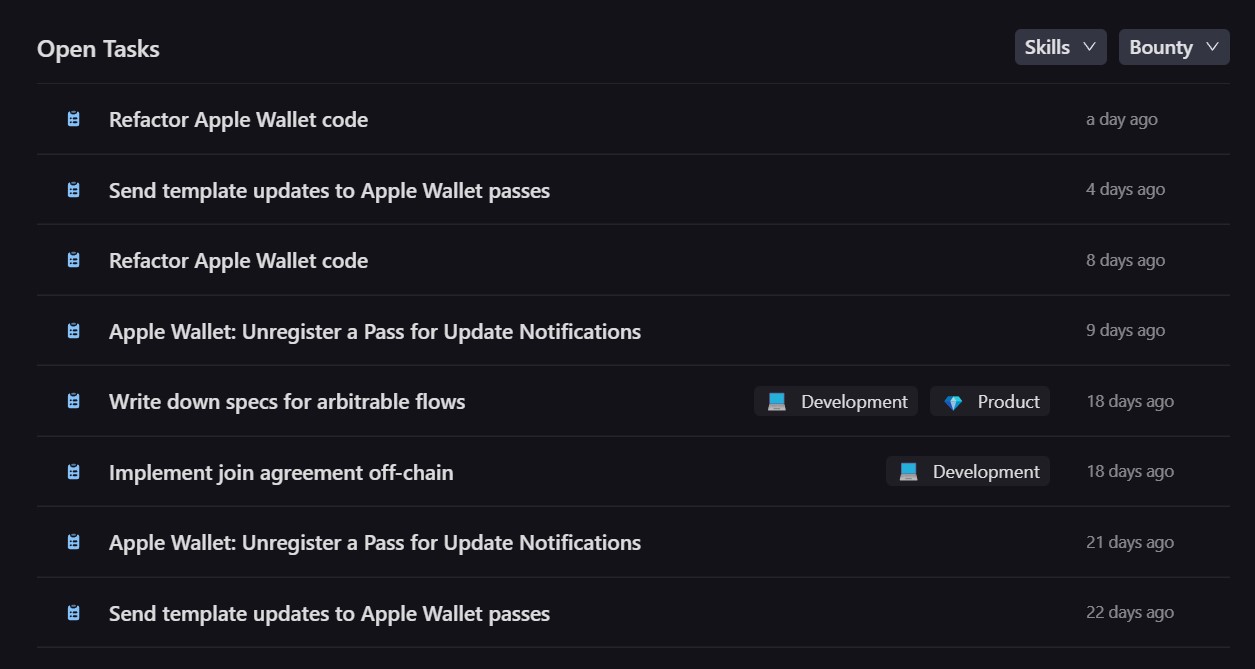 <figure><img src="https://1687189122-files.gitbook.io/~/files/v0/b/gitbook-x-prod.appspot.com/o/spaces%2Fmz45Sf20wOeXiwishs9R%2Fuploads%2F4ZbS2BoMTdFaXvq4AByP%2FContributors-Bounties-07.jpg?alt=media&#x26;token=60a946e2-a9c7-4143-93e5-ba23c1d3114b" alt=""><figcaption><p>An example of Open Tasks available on the Overview page of Nation3</p></figcaption></figure>