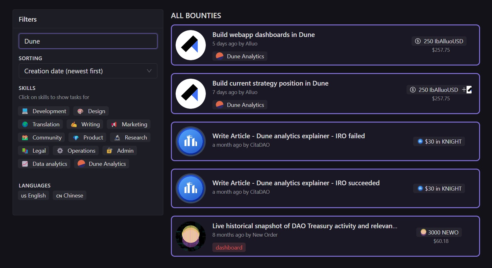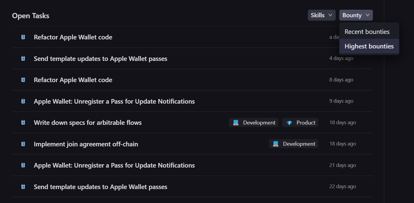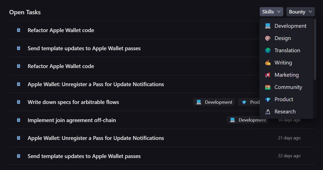 Filter bounties by global skills (DAOs select skills required for tasks to help you better match with them)