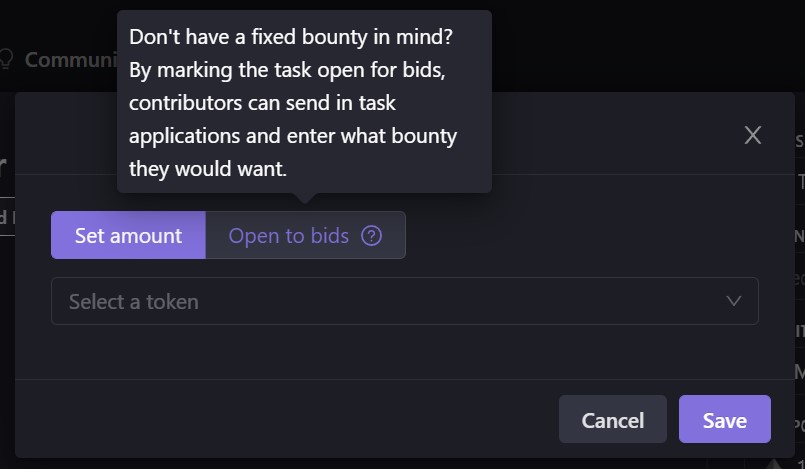 Open to bids: allow contributors to bid on how much they want to be rewarded for completing the bounty, with tokens that you set.