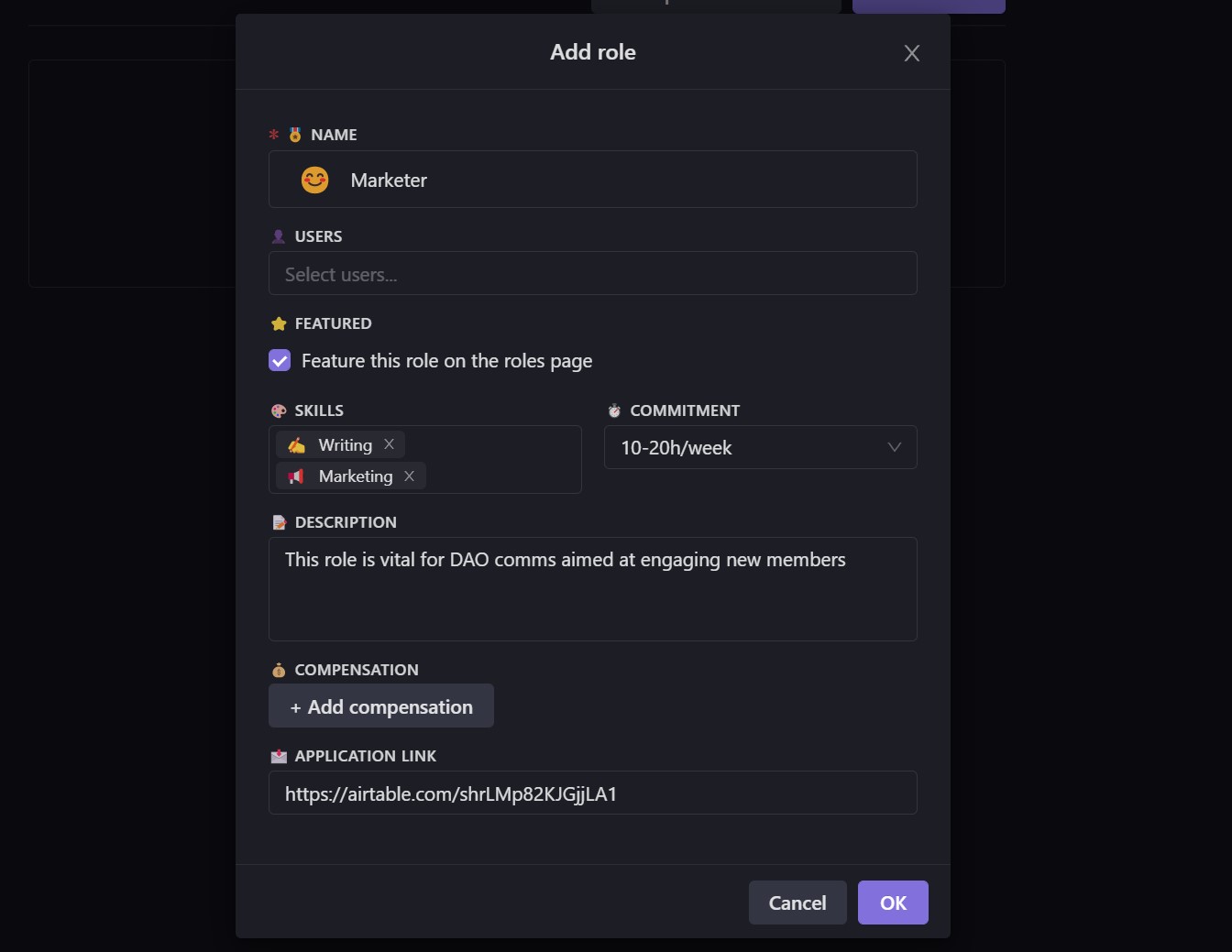 **Step 2**: Check  `Feature this role on the roles page`  and fill out the rest of the details, then click  `OK`