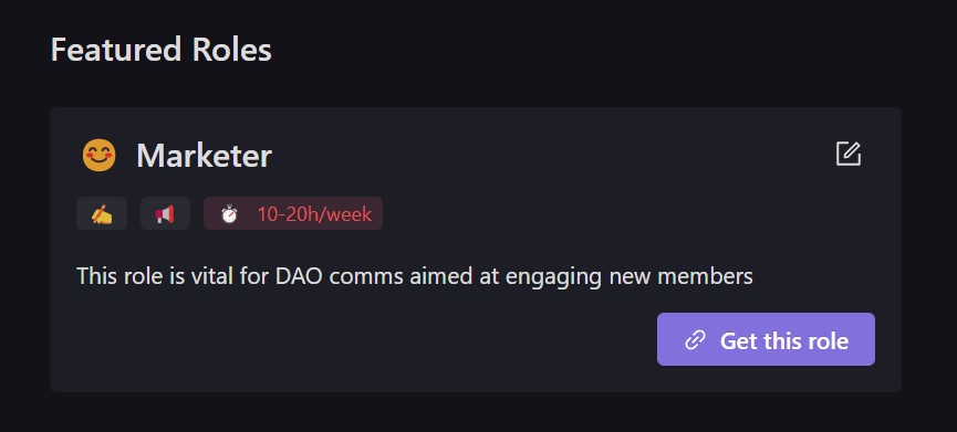 <figure><img src="https://1687189122-files.gitbook.io/~/files/v0/b/gitbook-x-prod.appspot.com/o/spaces%2Fmz45Sf20wOeXiwishs9R%2Fuploads%2FEtajteicw7p5X4YPBe6r%2FDAO-Features-Featured%20Roles-03.jpg?alt=media&#x26;token=11c0a1bd-2644-4cda-9ce9-639a739c9caa" alt=""><figcaption><p>The role is now featured!</p></figcaption></figure>